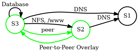 Cartographer agents self-organize into P2P overlay networks in order to exchange management information, software updates, and events. Systems, in Cartographer's model, can be both clients and servers just as in real life. A system is considered a server if it provides some service to a client. A system is considered a client if it utilizes a service from some server. Systems are considered peers if they both utilize the same server for some particular service. The graph below illustrates that nodes S1 and S3 are peers because they both utilize the DNS service from node S1.
