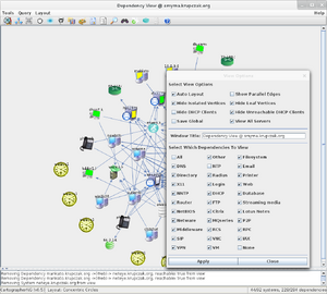 A dependency view of the example distributed system. This view utilizes a directed graph to show both intra and inter-system dependencies. The default layout for a dependency view uses a concentric circles layout algorithm.