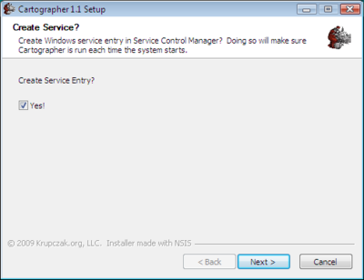 The installer then asks if you would like to create the service entry in the Windows Service Control Manager. Select Yes if you want the Cartographer agent to automatically start at system boot time.