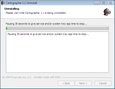 The uninstaller then asks for your patience while it stops the Cartographer agent and system tray application (if applicable). It can take up to 30 seconds to stop Cartographer due to the fact that it has many threads doing many things and the installer is trying to shut them down cleanly. Since we are uninstalling, why do we care if Cartographer is shut down cleanly?