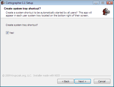 The installer then asks if you would like to create the shortcut to the Cartographer system tray application. Creating the shortcut will allow it to start each time the system boots and users log on.